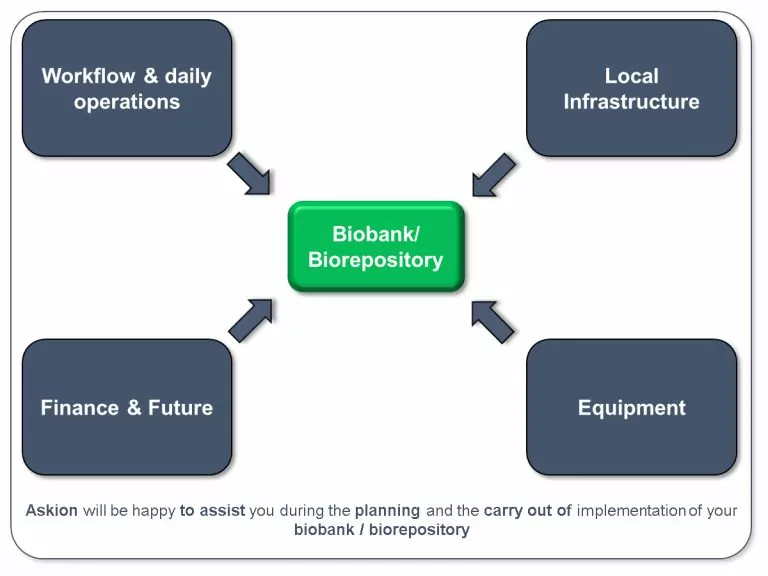为确定最合适、可持续的解决方案,ASKION可协助运营方建设生物样本库。在此过程中,ASKION会充分考量当前及未来的各类挑战。我们将与运营方共同分析,并就核心议题提供全程指导,包括但不限于: